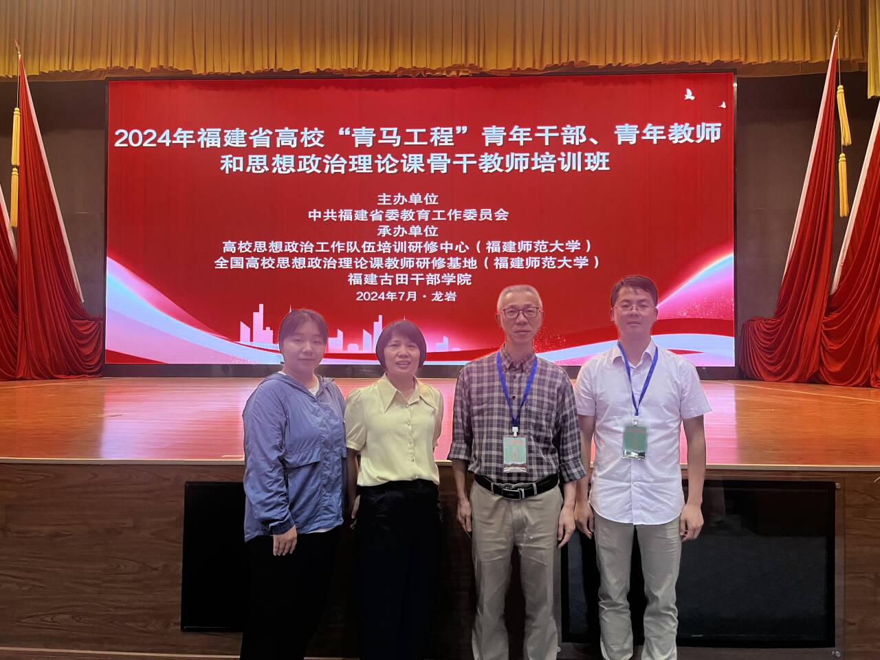 为深入学习贯彻党的二十届三中全会精神,全面贯彻落实习近平总书记对学校思政课建设的重要指示和新时代学校思政课建设推进会精神,2024年7月22日至24日,我校马克思主义学院教师胡济林、丁爱芝、江洪、林美辰一行4人参加在古田干部学院举行的福建省高校“青马工程”青年干部、青年教师和思想政治理论课骨干教师研修班。