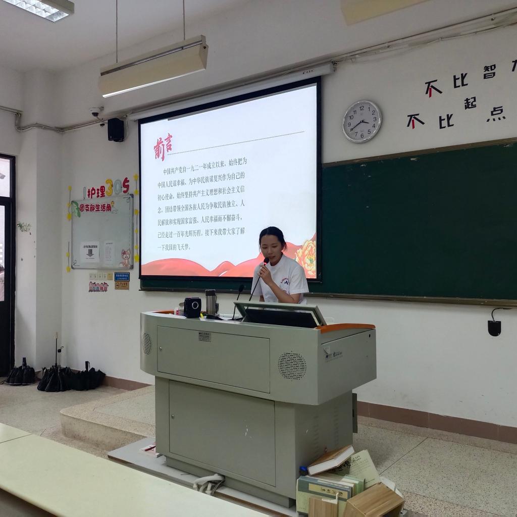 本次宣讲的是江丽清和陈可欣小组,宣讲人江丽清同学,宣讲主题是中国梦航天梦。江丽清从介绍了中国古人对天空的奇思妙想,再到万户火箭飞行的大胆尝试,从世界上第一颗人造卫星对我国航天事业的激励,再到我国东方红一号的成功发射,演绎了我国人民怀揣不懈追求的航天梦,敢于战胜一切艰难险阻,勇于攀登航天科技高峰的载人航天精神。雄关漫道真如铁,而今迈步从头越。江丽清说:“探索浩瀚宇宙,发展航天事业,建设航天强国,是我们不懈追求的航天梦。”