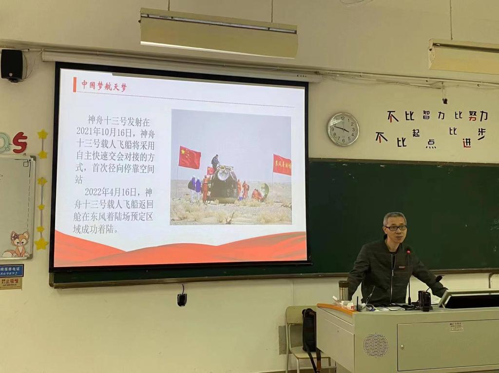 扬帆起航,逐梦九天,我们的征途是星辰大海,面对浩瀚的宇宙,人类是渺小的,但人类的探索精神是伟大的。一代代中国航天人以追逐梦想的热情和坚忍不拔的壮志,创造出“两弹一星”精神、载人航天精神、北斗精神和探月精神,丰富了中华民族的宝贵精神财富,彰显了坚定的中国特色社会主义道路自信、理论自信、制度自信、文化自信。2022年5月11日下午,习近平新时代中国特色社会主义思想读书社宣讲团在胡济林老师的组织下,到教学楼112为21影像501、检验501班开展线下宣讲交流。在面对面交流中,我们向同学们宣传了我们的中国梦航天梦,提升大家对祖国航空航天事业的认识,坚定了“四个自信”。