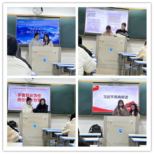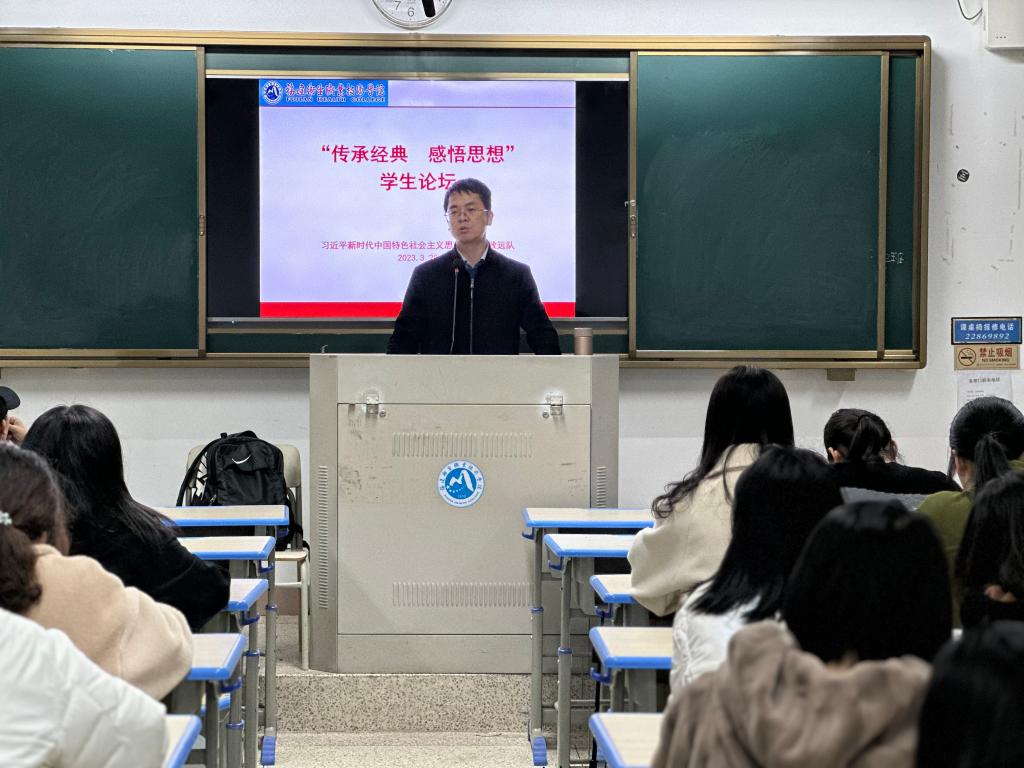 2023年3月28日,习近平新时代中国特色社会主义思想读书社致远队在教学楼302围绕教材《习近平用典》开展“传承经典 感悟思想”学生论坛课堂实践活动。活动由指导老师江洪主持,全体选课学生参加了活动。