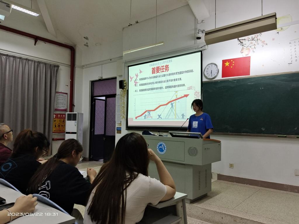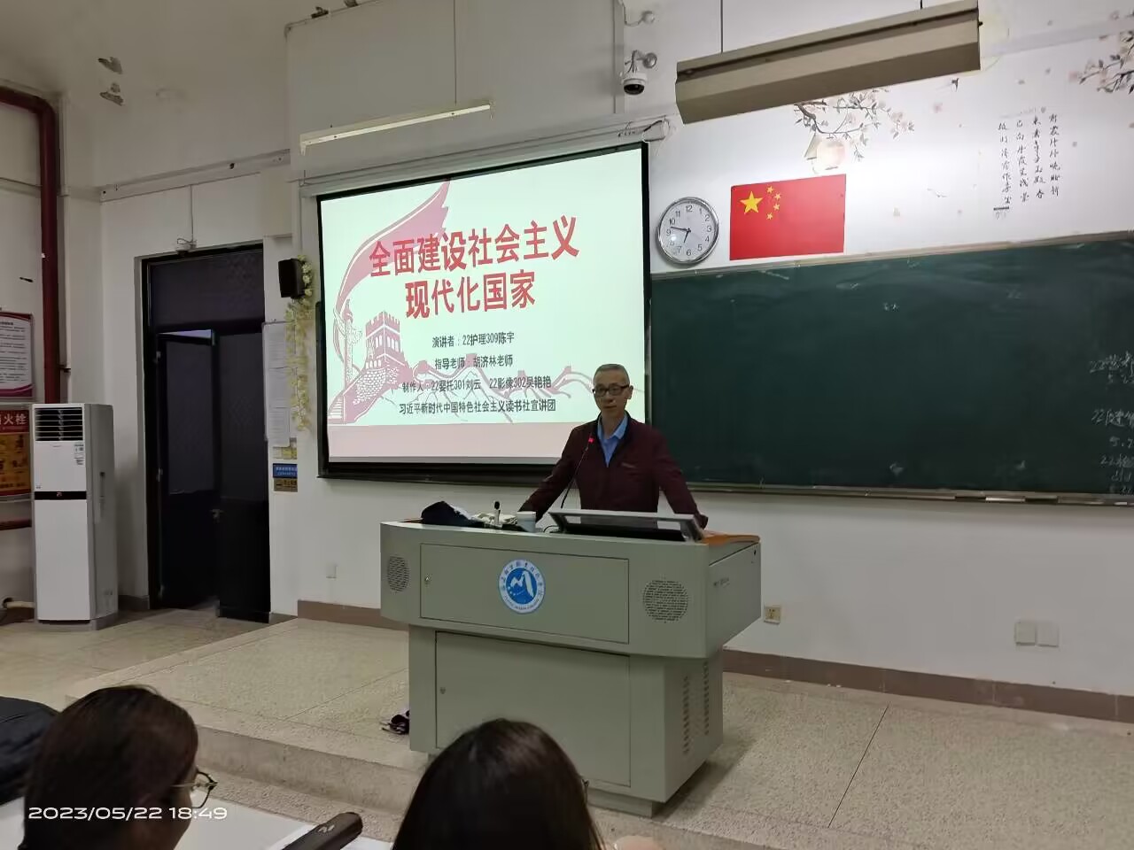 本次宣讲人是22护理309班的陈宇,她宣讲的主题是“全面建设社会主义现代化国家”。陈宇先对全国两会精神作了简要的介绍,接着从“重大原则”“首要任务”“发展格局”“发展关键点”等方面阐述全面建设社会主义现代化国家。