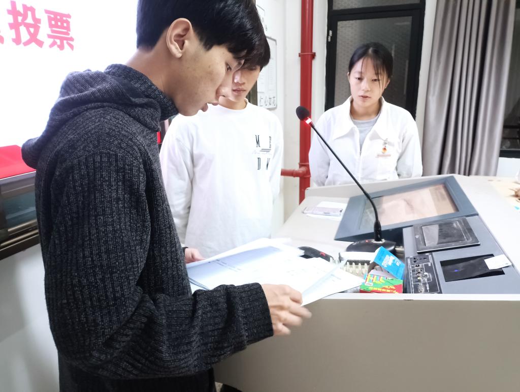 大会第三项议程:功能型团支部委员会选举。刘羽珊宣读选票填写规则及其注意事项,监票人发放选票。各位团员填写选票后由检票员收集,收集完毕由监票人和选举工作人员验票,由记票人员记票。