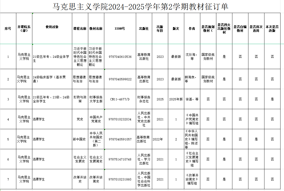 根据教务处下发的教材选用通知,经各课程负责人、教研室主任初审,马克思主义学院教材建设小组审核,拟定2024-2025学年第二学期教材选用情况如下: