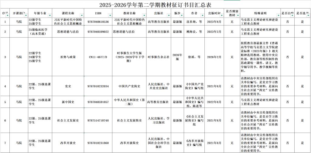 根据教务处下发的教材选用通知,经各课程负责人、教研室主任初审,马克思主义学院教材建设小组审核,拟定2025-2026学年第二学期教材选用情况如下: