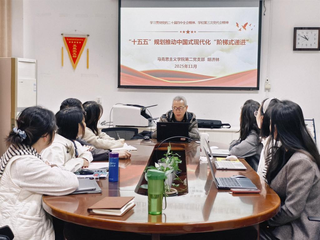 为深入学习贯彻党的二十届四中全会精神,深入解读国家发展战略,2025年11月20日,马克思主义学院第二党支部书记胡济林在厚德楼107,为支部全体党员讲授题为《“十五五”规划推动中国式现代化“阶梯式递进”》的主题党课。