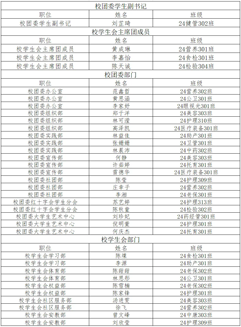 为进一步发挥学生组织在团结和引领广大同学方面的职能作用,切实增强其凝聚力与执行力,巩固其作为师生沟通桥梁的重要地位,经全面考察、综合评议,我们选拔出一批理想信念坚定、作风扎实、能力突出的学生组织骨干成员。经过严格的推荐、审核与公示程序,福建卫生职业技术学院校团委学生会新一届骨干成员名单现已确定,组织调整工作顺利完成。现将名单公布如下: