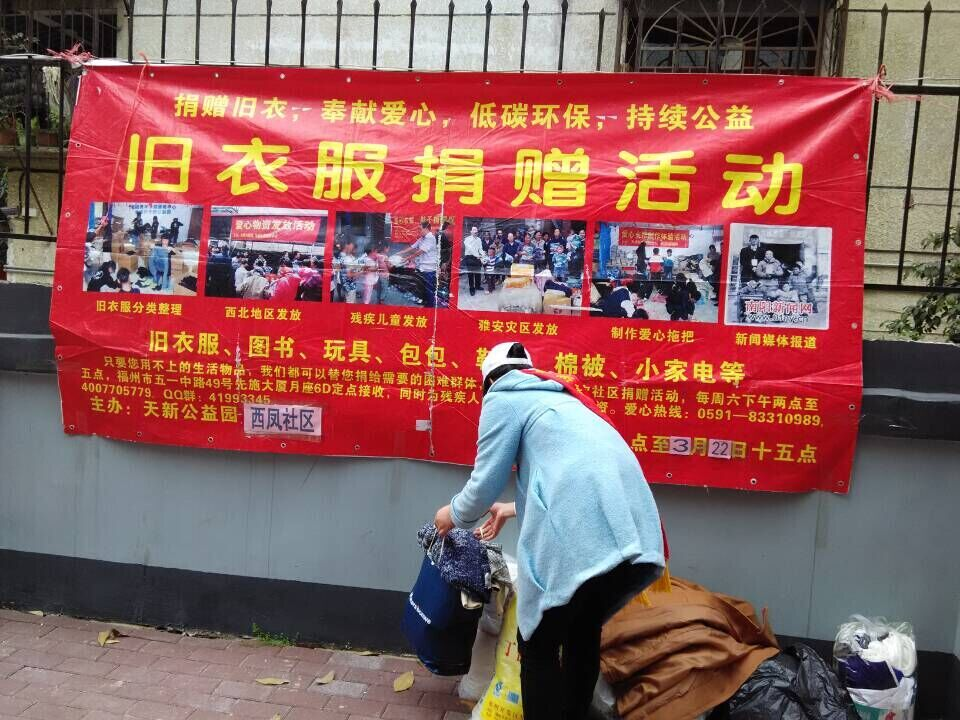 “给与别人幸福,自己收获快乐。我们只需把闲置的衣服、被褥、学习用品等捐献出来,把他们交给最需要的人。您的慷慨解囊将被他人铭记,您的乐善好施将得到他人尊重,您伸出的援助之手,可以为他人的生活增添一份感动,也会给自己的生活增添一份温馨”。在志愿者的积极推广下,捐赠当天,居民们早早地在服务点排好了队,等待着捐赠活动的开始。活动进行过程中,居民不断送来衣物,并在签名册上留下自己的姓名,以及他们的爱心寄语,并与志愿者合影留念,为本次捐衣活动画上圆满句号。