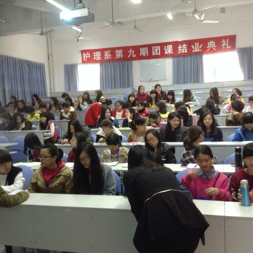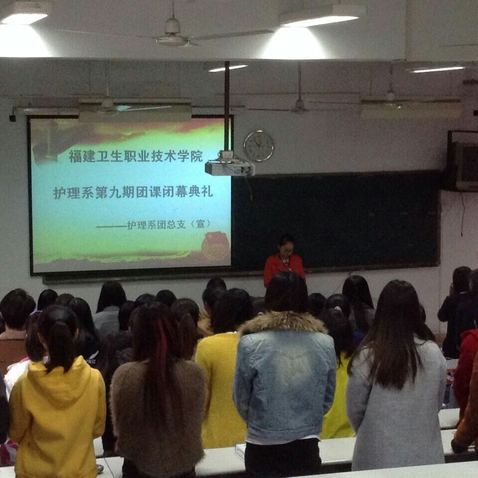 福建卫生职业技术学院护理系第九期团课培训班闭幕仪式于2014年12月2日下午1点在护理系第一阶梯教室隆重举行,出席本次仪式的有护理系团总支副书记林丹丹同学、团总支组织委员文雯同学、团总支宣传委员李海飞同学、团总支纪检委员张冬芳同学以及14级新团课学员。