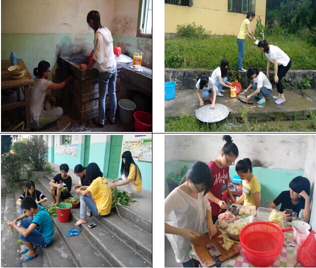 【上图:志愿者在兰溪小学支教的生活——摘菜、做饭、洗碗、劈材 谢涛/图】