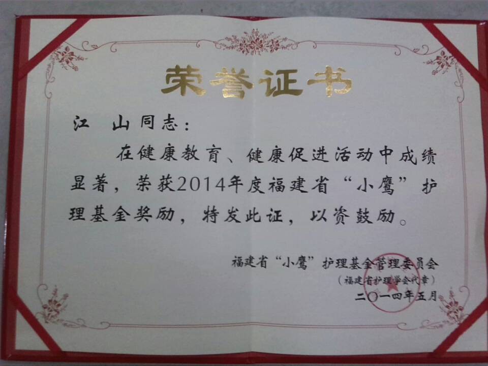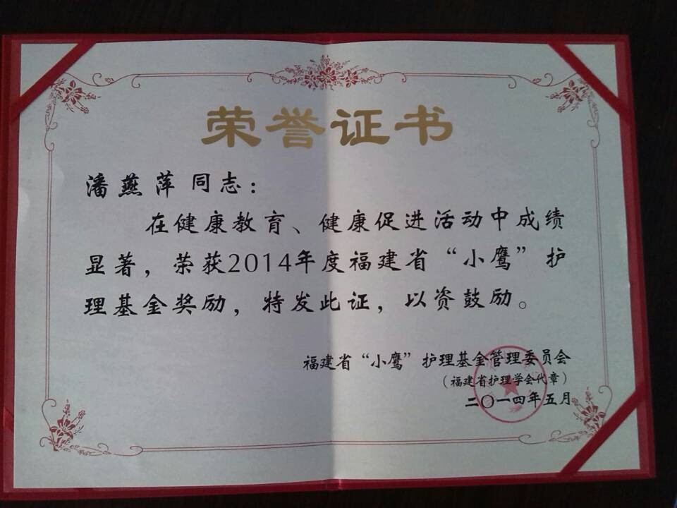 年福建省“小鹰”护理基金管理委员会、福建省护理学会、福建医科大学联合授予的福建省第二届“小鹰”护理基金奖。