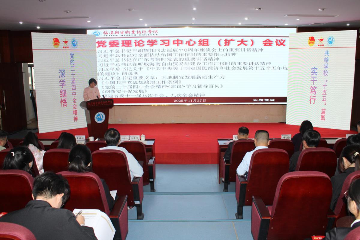 11月27日,我校在笃行楼四楼报告厅举办党的二十届四中全会精神及学校第三次党代会精神专题宣讲会。教育系统学习宣传贯彻党的二十届四中全会精神“百人宣讲团”成员、校党委书记曾武祈同志以“深学细悟党的二十届四中全会精神,实干笃行共绘学校‘十五五’蓝图”为主题作宣讲报告。校领导班子成员、全体中层正职(含主持工作)、第十三期“青马工程”团学骨干培训班学员共计200余人参会,会议由校党委副书记李美华主持。