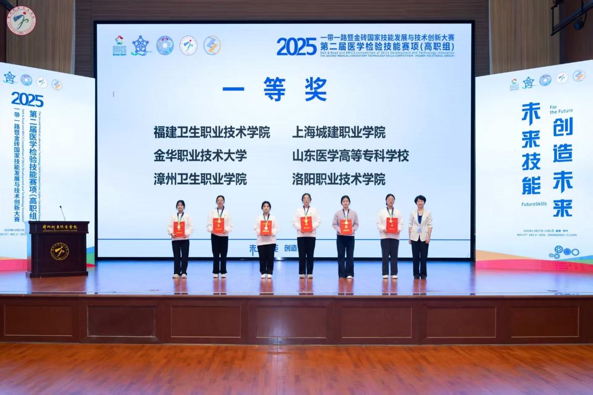 11月27日—30日, 2025“一带一路”暨金砖国家技术发展与创新大赛第二届医学检验技能竞赛(高职组)在漳州卫生职业学院举行,来自全国各地的60支队伍同台竞技。经过激烈的角逐和比拼,我校23级检验302班危恬慧、23级检验303班张丽珍、23级检验304班张欣荧等三位学生凭借扎实的专业基础和出色的现场表现,勇夺桂冠,取得团体第一名的优异成绩,获得优先出国比赛的机会。学校荣获“最佳组织奖”,指导老师林雪金、吴静荣获“优秀指导教师”荣誉称号。充分展示了我校医学检验技术人才的培养质量与教学实力!