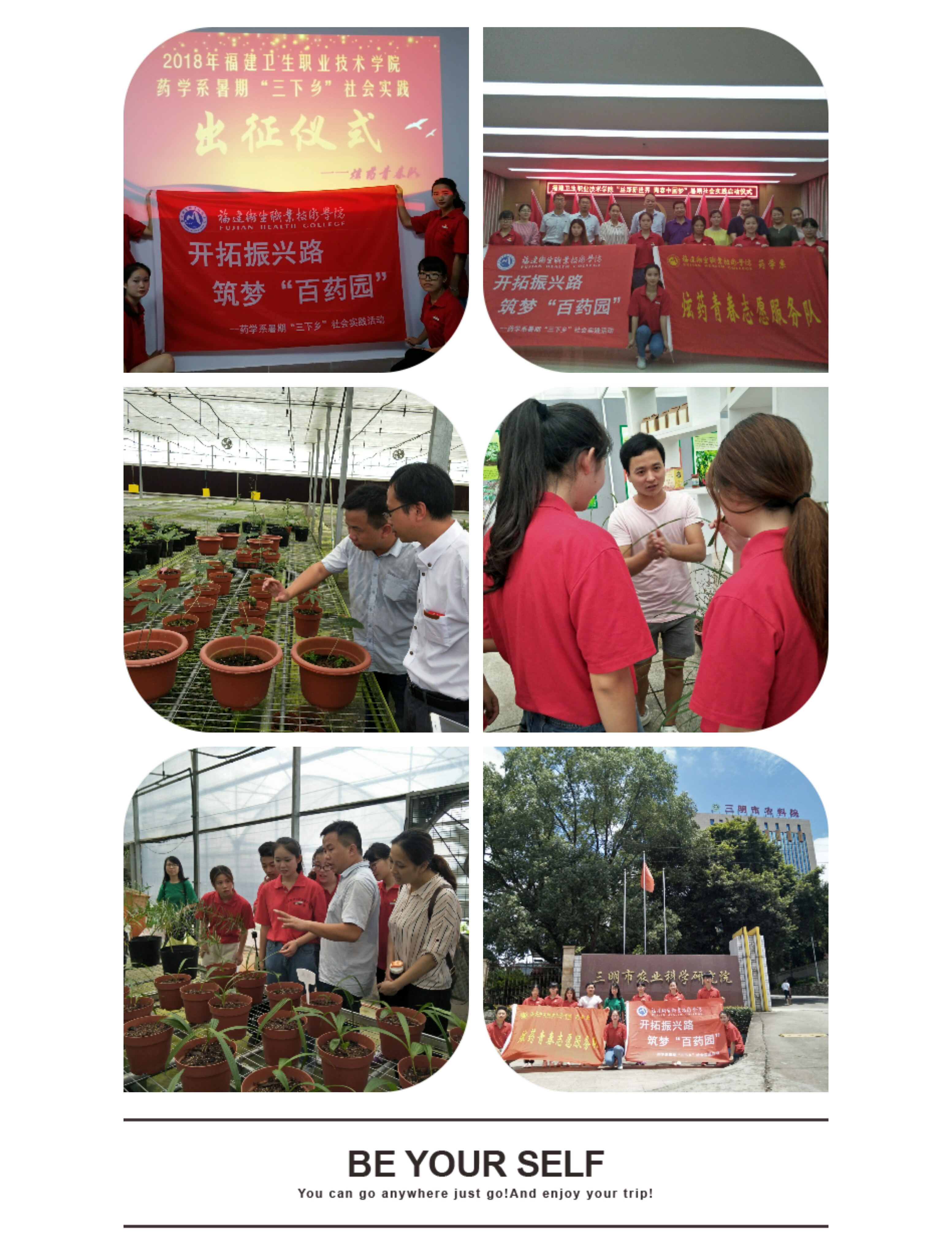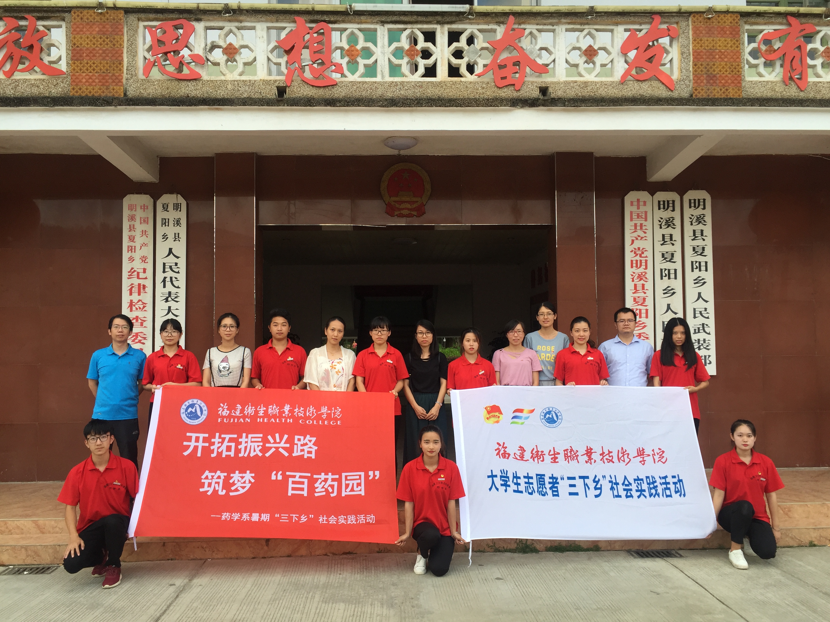 为深入学习宣传贯彻习近平新时代中国特色社会主义思想和党的十九大精神,引导青年学生在投身“一带一路”倡议的生动实践中成长成才,福建卫生职业技术学院药学系积极响应号召,通过网络申报立项,承接团中央学校部“丝路新世界·青春中国梦”大学生暑期社会实践专项行动。此次行动,我系成立“炫药青春”实践团,由党总支陈洁副书记,团总支黄嵩梅、尹德爱老师,专业指导老师邓元荣、何舒澜、林贵灿老师,辅导员苏素娇、高施老师及10名学生组成,全团18人于2018年7月13日—7月17日奔赴三明市明溪县夏阳乡展开实地调研,以“开拓振兴路,筑梦百药园”为主题,联合当地乡镇政府,围绕道地药材种植,助力产业振兴。