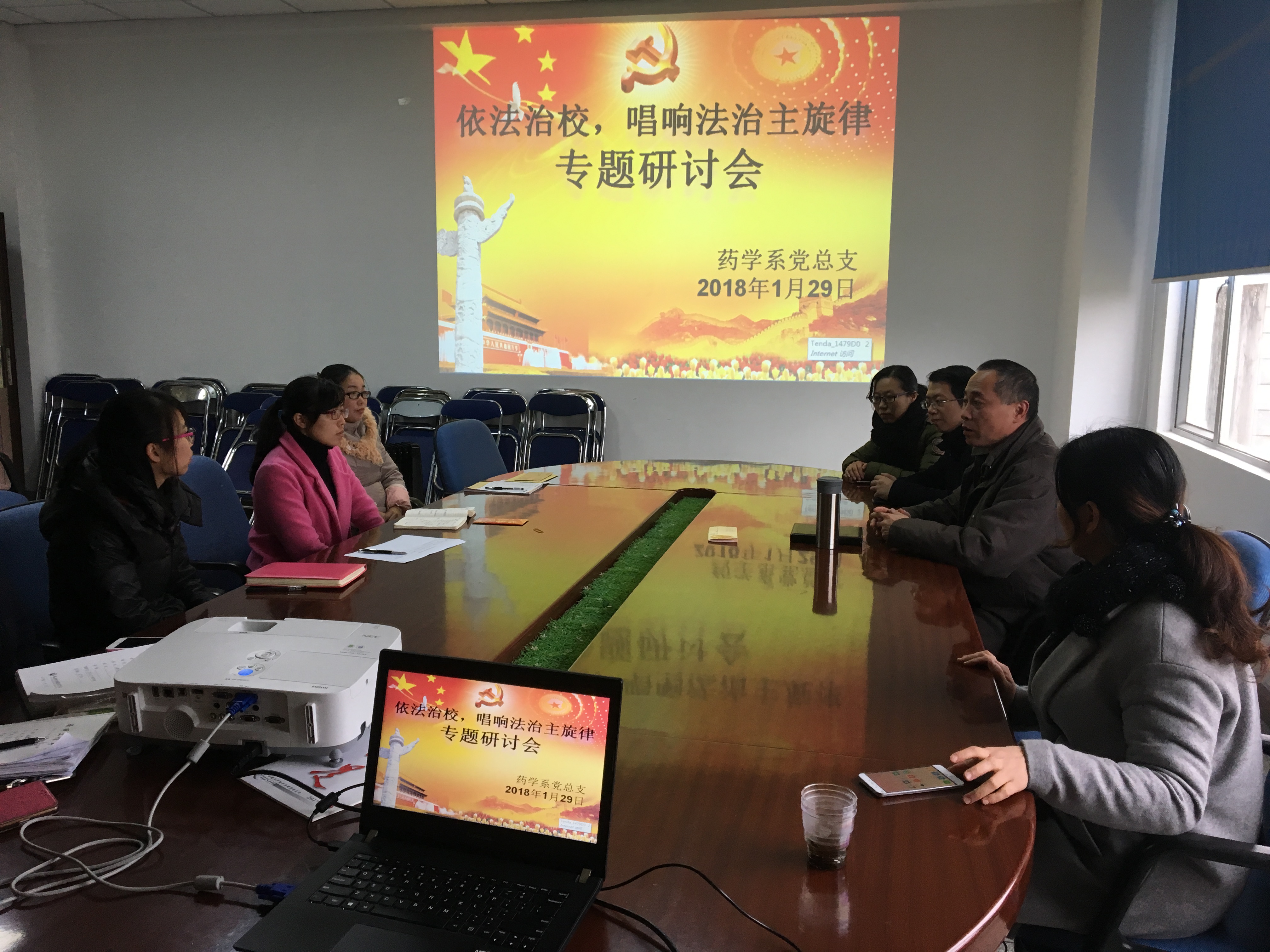 1月29日,药学系党总支在系会议室召开“依法治校,唱响法治主旋律”的专题研讨会。药学系党总支委员、领导班子成员、各支部书记参加了本次研讨会。依法治校是依法治国的重要组成部分,也是依法治国在大学教育中的具体体现。高校是传承弘扬人类先进文明的重要场所,是捍卫法治权威、维护社会公平正义的坚强阵地。我们要大力开展法治教育,培养社会主义法治的忠实崇尚者、自觉遵守者、坚定捍卫者。